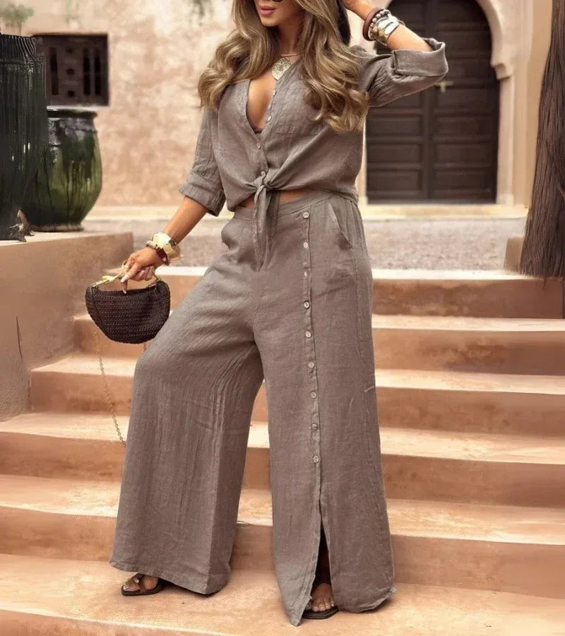 Conjunto ligero de dos piezas, compuesto por una blusa de manga larga anudada al frente y un pantalón fluido con botones laterales. Su tejido fresco y su corte holgado lo convierten en una opción ideal para los días cálidos, combinando comodidad, elegancia y un estilo natural.