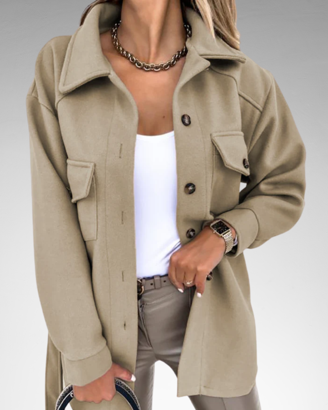 Sobrecamisa tipo shacket con diseño moderno y tejido cálido, perfecta para entretiempo o invierno suave. Su corte ligeramente oversize y los bolsillos frontales con solapa aportan un aire relajado y sofisticado. Ideal para llevar abierta con camiseta básica o cerrada a modo de chaqueta.