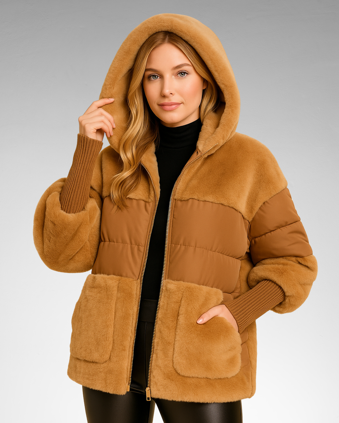 Abrigo corto de peluche sintético combinado con forro, con un acabado voluminoso. Su textura suave y su diseño acolchado ofrecen calidez sin renunciar al estilo.