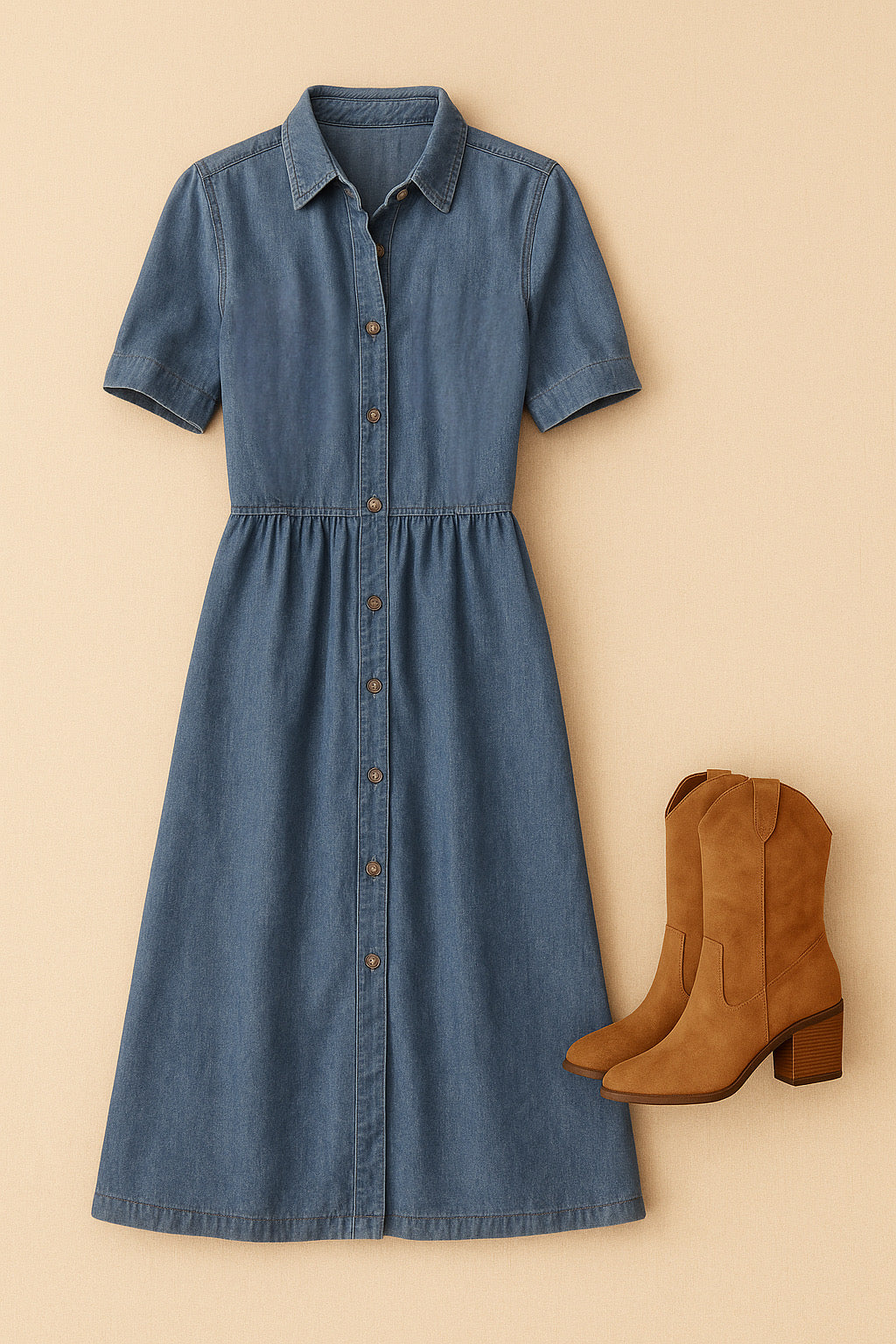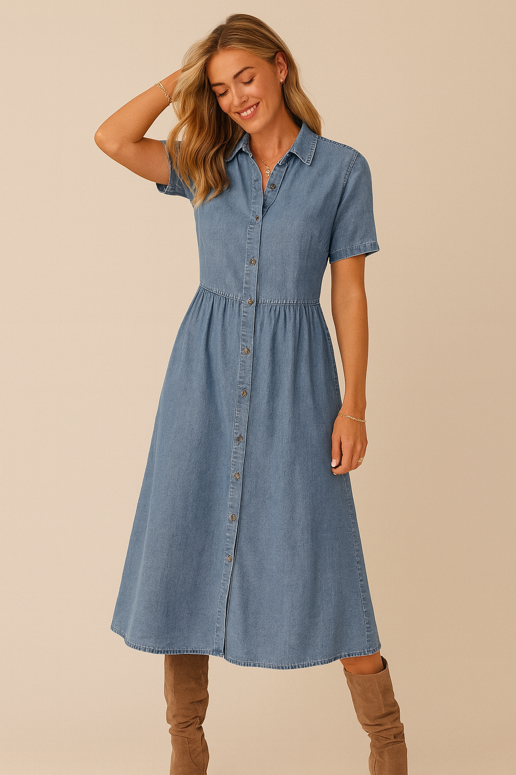 El vestido Mamba Denim combina la elegancia casual del tejido vaquero con un corte femenino y atemporal. Su diseño de botones frontales, cintura ajustada y falda fluida lo convierte en una prenda versátil ideal para el entretiempo. Perfecto tanto para un paseo relajado como para un look más pulido con botas o sandalias.