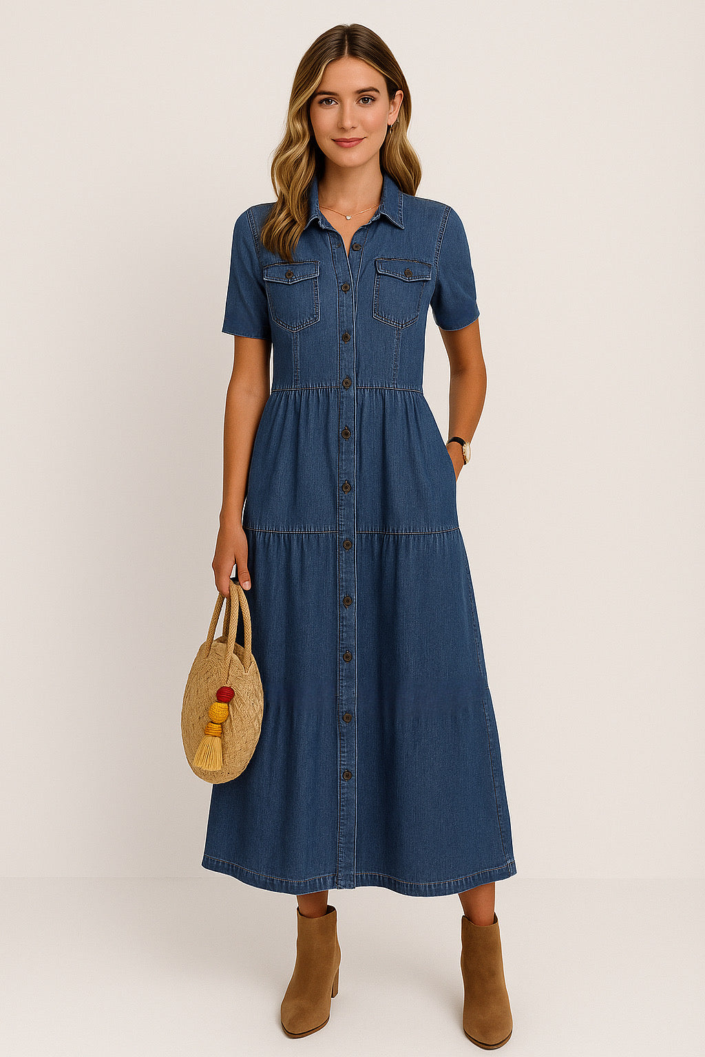 Vestido largo camisero denim con botones frontales y corte ajustado en la cintura para realzar la silueta. Su estilo atemporal y cómodo lo convierte en un imprescindible del armario, ideal tanto para looks casuales de día como para eventos informales.