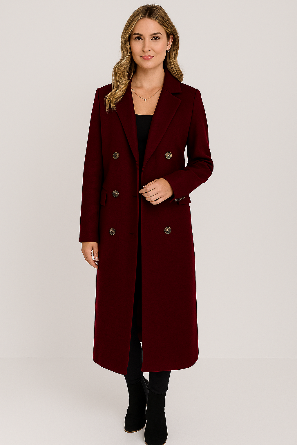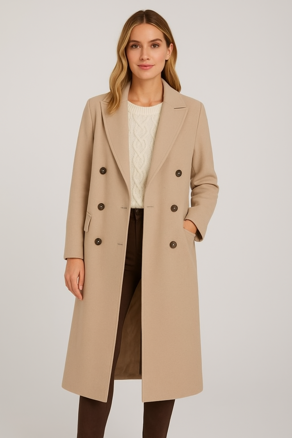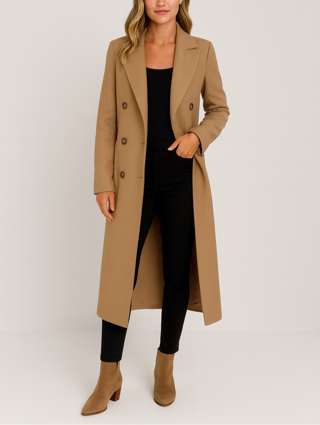 Abrigo largo de corte clásico en color camel, un imprescindible del fondo de armario. Su diseño estructurado con solapas amplias, doble botonadura y bolsillos laterales aporta elegancia y versatilidad.