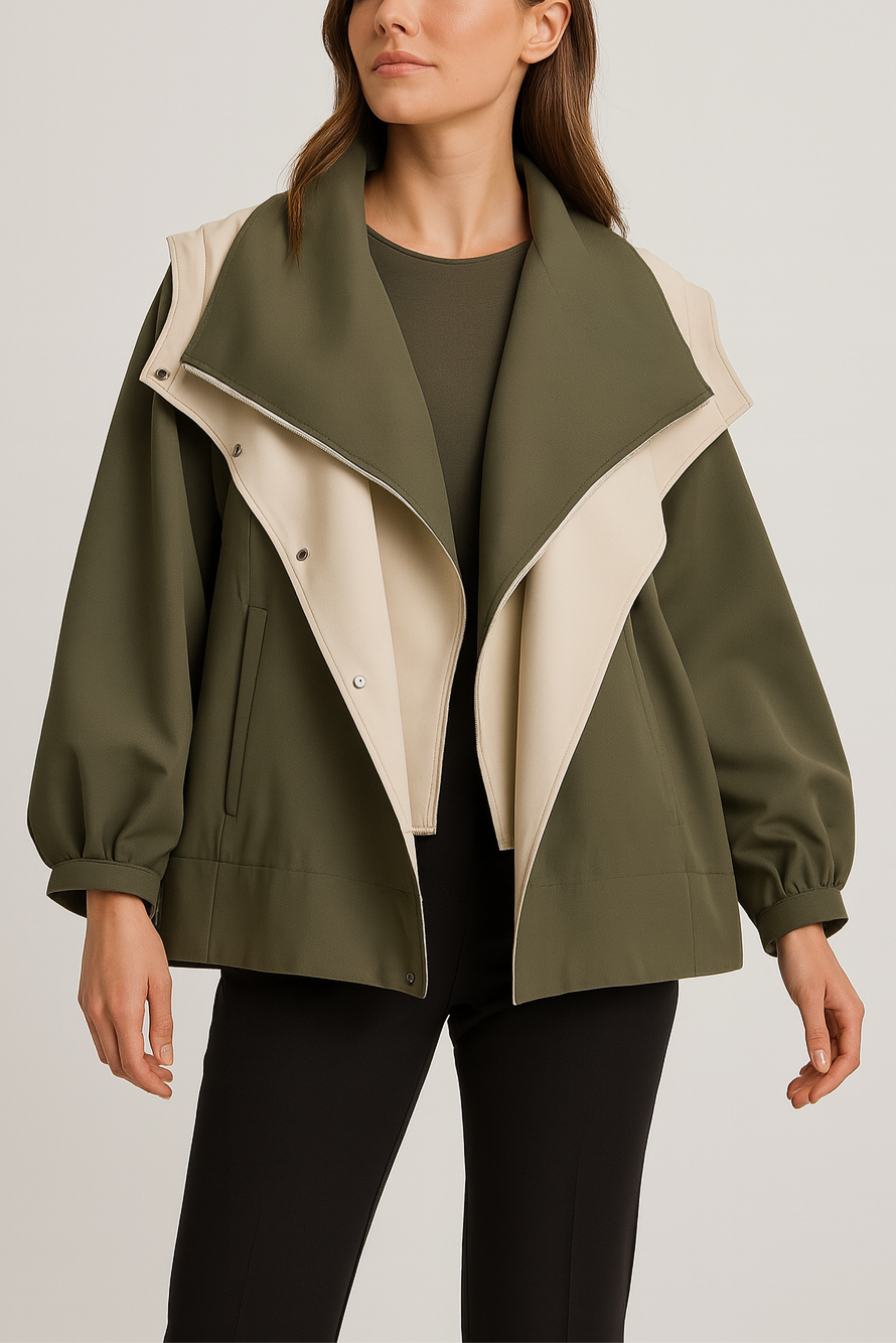 Chaqueta tipo bomber elegante con cuello solapa doble y efecto capa, ideal para entretiempo o días frescos. Su diseño estructurado con caída fluida combina estilo y comodidad, aportando un toque sofisticado tanto para looks casuales como más formales. El contraste de colores realza la silueta y aporta un aire moderno y refinado.