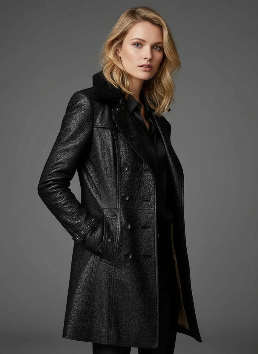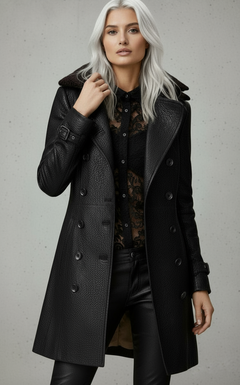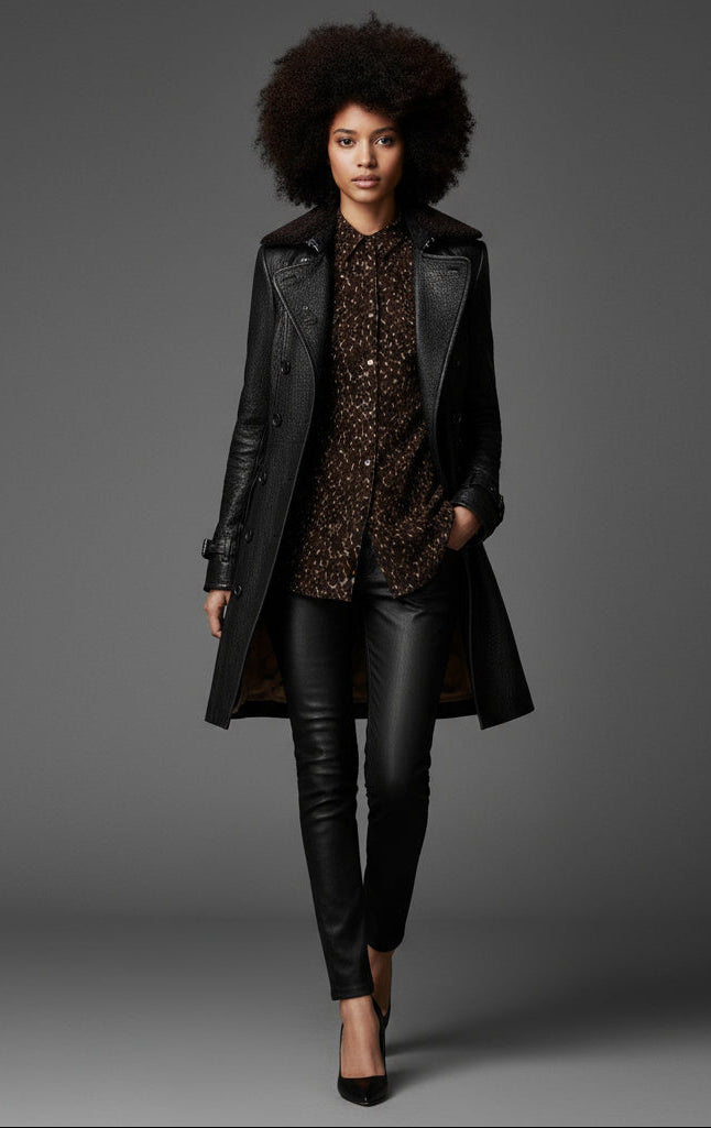 Este abrigo largo de efecto cuero combina la fuerza del estilo urbano con la elegancia atemporal. Su diseño estructurado con cuello de borreguito y cierre cruzado aporta un toque sofisticado y cálido, ideal para elevar cualquier look de otoño e invierno.