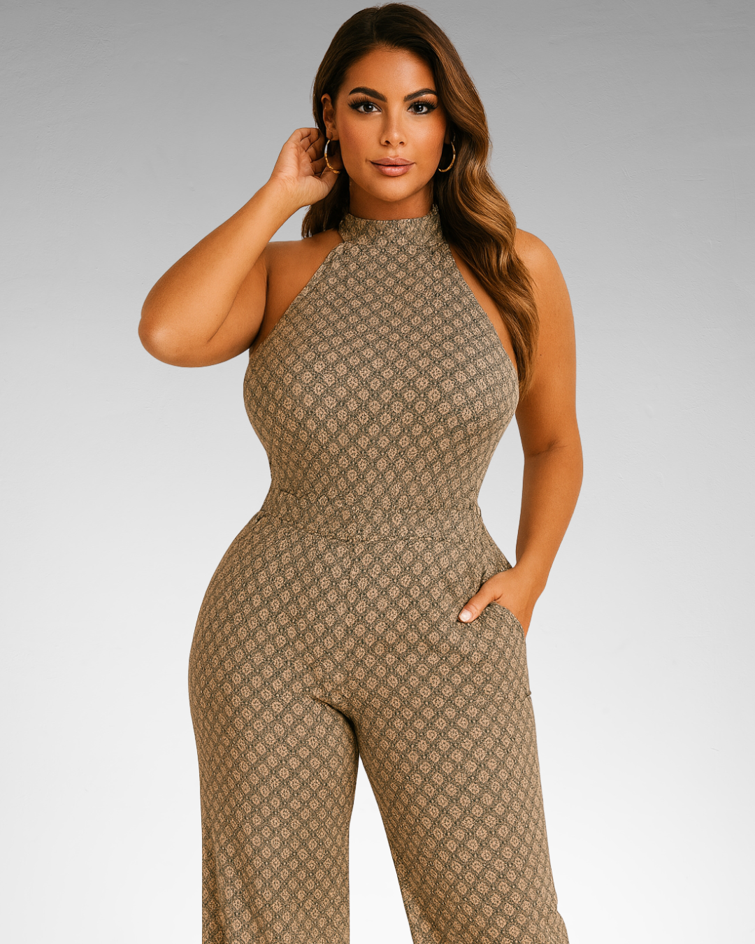 Mono largo estampado boho con cuello halter y pernera ancha. Su diseño sin mangas estiliza la figura mientras el corte fluido ofrece libertad y elegancia. Combina estilo y comodidad en una sola prenda.