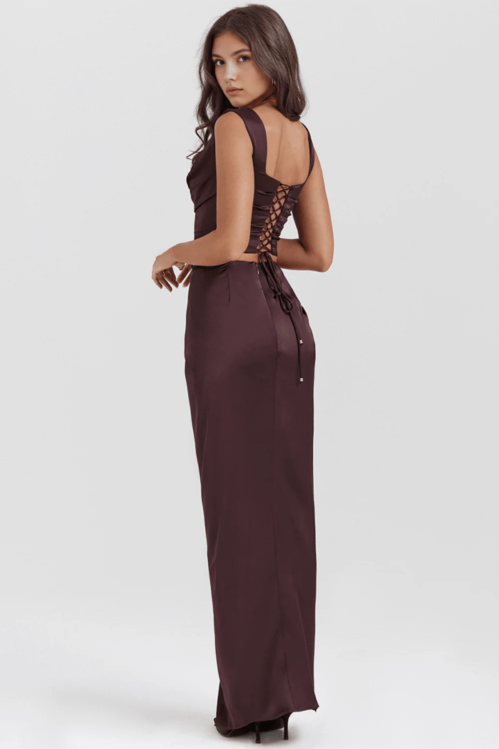 Conjunto de dos piezas en tono chocolate compuesto por top entallado con escote cuadrado y falda larga con abertura lateral. Su tejido satinado se ajusta al cuerpo realzando la figura con un toque elegante y sensual. Perfecto para noches especiales, cenas o eventos donde quieras destacar con estilo.