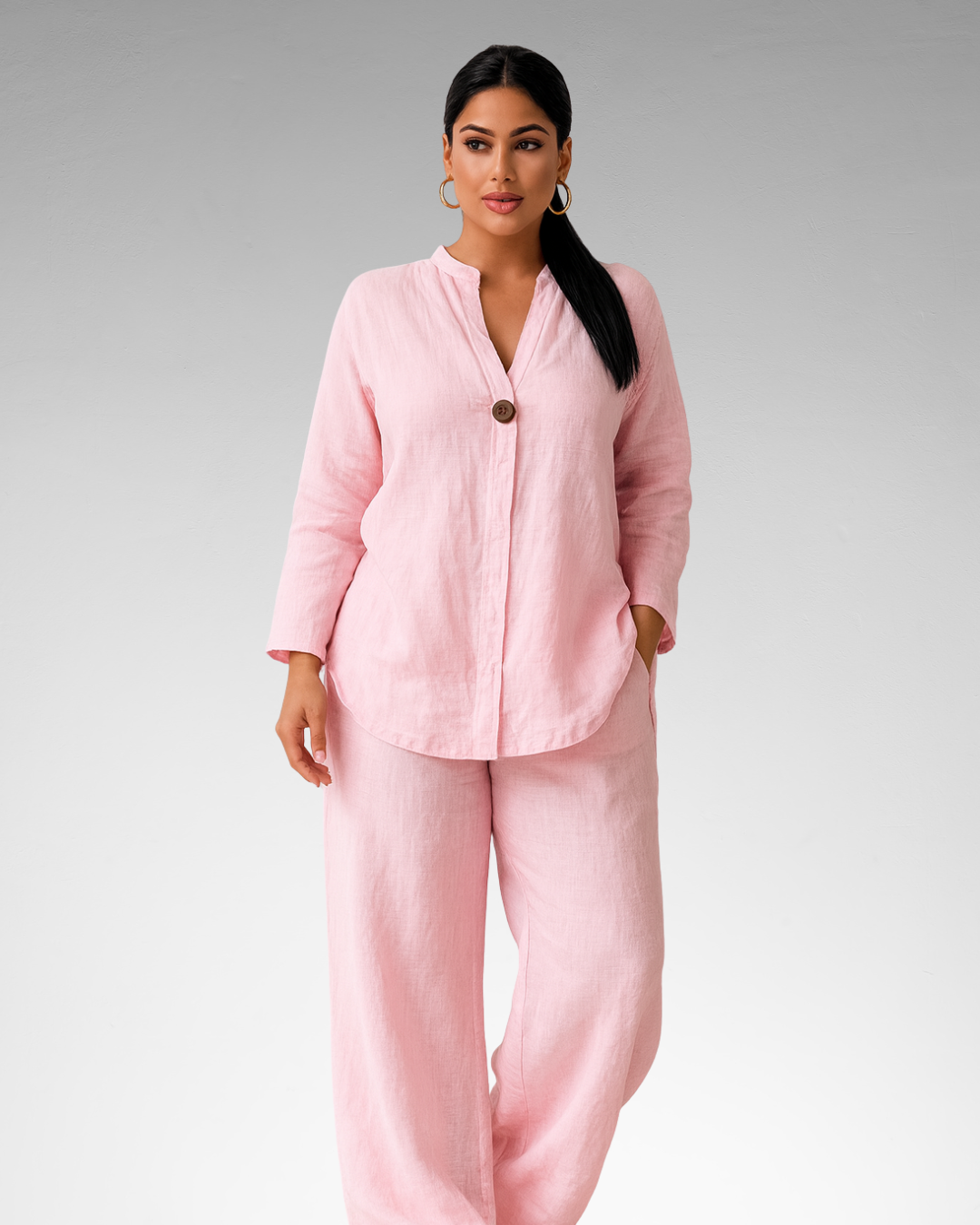 Conjunto de lino relajado y elegante compuesto por camisa holgada y pantalón de pierna ancha. Su estilo atemporal y su tono suave aportan frescura y comodidad, perfecto tanto para días casuales como para looks más pulidos. Ideal para quienes buscan un outfit ligero, natural y sofisticado.